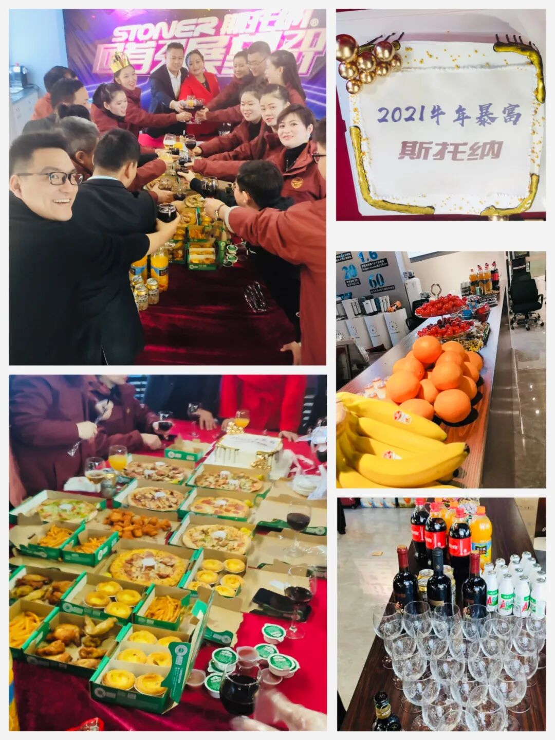 在热烈的气氛中,聚餐环节伊始,主持人特邀谢总现场致辞,举杯感恩致谢STONER斯托纳的伙伴们全年的付出与努力,寄言STONER斯托纳在5周年即将到来之际,公司因为有大家一路同行,可以接受更大的挑战,取得更大的成就!接着,主持人捧出了精心准备好的斯托纳2021牛年暴富大蛋糕和披萨水果等,为公司本季度的小寿星们举办了生日会。大家都站起来举杯欢呼,随后就是一顿风卷残云,全场欢声笑语,其乐融融,STONER新年派对在美好祝福声中圆满结束。