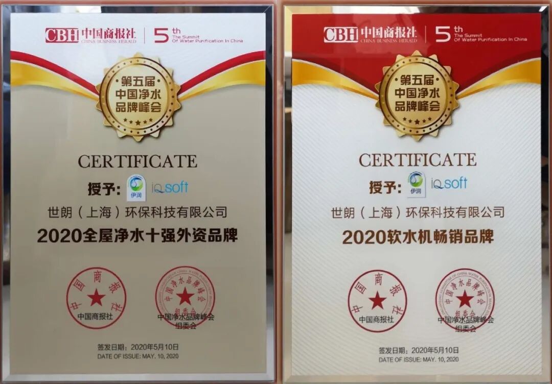 斯托纳旗下子公司世朗环保荣获了2020全屋净水十强外资品牌,以及携手ERIE IQSOFT伊润荣获了2020软水机畅销品牌。